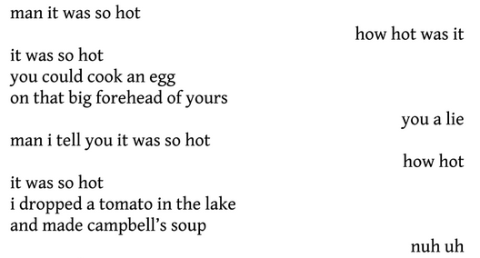 Het bevattingsvermogen achter dit soort verzen is nuchter en gul, een bevattingsvermogen dat weids heeft gelezen en geen genoegen neemt met verouderde gedachten. De dichter is moedig, hoewel Ewing zelf zich bescheiden opstelt (uit datzelfde voorwoord): ‘This collection of poems is meant as a small offering, an entry point into a conversation about a part of our history that I think is worth talking about much more than we do.’ De bundel bevat foto’s, citaten, een van de gedichten is grotendeels zwart afgelakt, er zijn bijbelse passages, zelfs een tram komt heel even aan het woord, het idee ontstaat van een getuigenis, een wezenlijk document, van gedichten gered uit het vuur. Dit is de laatste strofe van ‘True Stories About the Great Fire’: