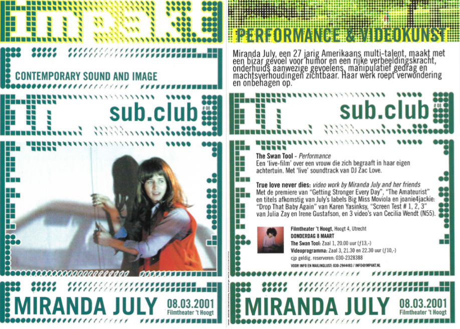 Voorjaar 2001, een jonge vrouw zeult een bijna twee meter lange koffer de trein in. De trein verlaat station Utrecht Centraal. De vrouw is een kunstenaar, nog aan het begin van haar carrière en op weg naar haar volgende performance. De dag ervoor heeft ze bij IMPAKT, een centrum voor Mediacultuur, een performance opgevoerd en een filmavond gepresenteerd. De vrouw is Miranda July en in de koffer – waar July zelf schril bij afsteekt – zit een speciaal scherm dat ze gebruikt voor de projecties in haar audiovisuele performance getiteld The Swan Tool. Miranda July met een bizar grote koffer – een scène die zo uit een van haar films of boeken had kunnen komen – het is typerend voor de gedrevenheid waarmee zij al sinds midden jaren negentig aan haar oeuvre werkt. Heel Europa heeft ze al afgereisd met het enorme scherm wanneer Arjon Dunnewind, oprichter en artistiek directeur van IMPAKT [Centrum voor Mediacultuur] haar op die dag in 2001 weer naar het station brengt.