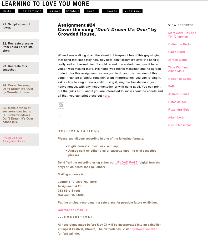 Speciaal voor deze festivaleditie publiceren Miranda en Harrell twee nieuwe uitdagingen op Learning to Love You More: ‘Assignment #24: Cover the song Don’t Dream It’s Over, by Crowded House’ en ‘Assignment #25: Make a video of someone dancing to DJ Brokenwindow’s Don’t Dream It’s Over dance mix’. Met het relatief eenvoudige karakter van de opdrachten hopen Miranda en Harrel deelnemers te bevrijden van de druk om iets te moeten creëren wat nog nooit gedaan is, of hoogst creatief is. Zonder deze druk ontstaat er een mogelijkheid voor deelnemers om dichter bij hun eigen gevoelens en ervaringen te komen. Daarnaast speelt het webproject door de eenvoud van de opdrachten met de kinderlijke onbevangenheid en verwondering die in veel van July’s werken terugkomt. Het volwassen publiek wordt gestimuleerd om alledaagse handelingen, situaties of objecten te benaderen als jonge kinderen, voor wie de nieuwigheid van de wereld nog niet is uitgewerkt.