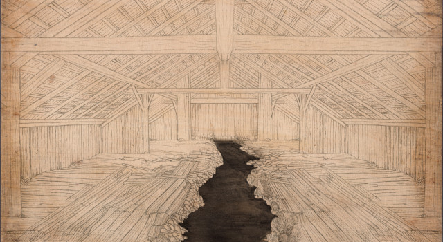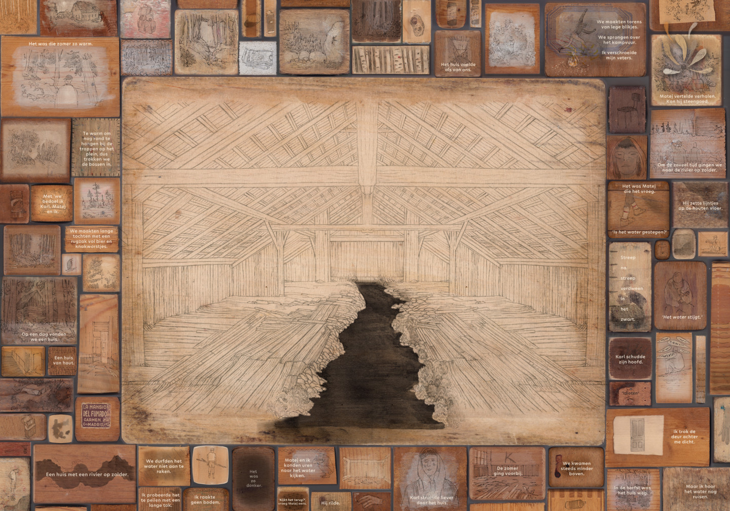Drie jongens vinden bij het struinen door de bossen een houten huis en in dat huis op zolder een rivier. Ludwig Volbeda vertelt in illustraties op meer dan zeventig kleine houten panelen het verhaal van de jongens, hun zoektocht en het wonderbaarlijke huis.