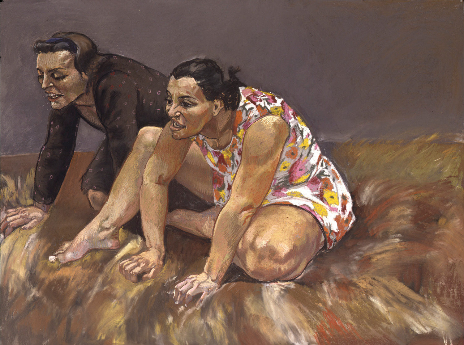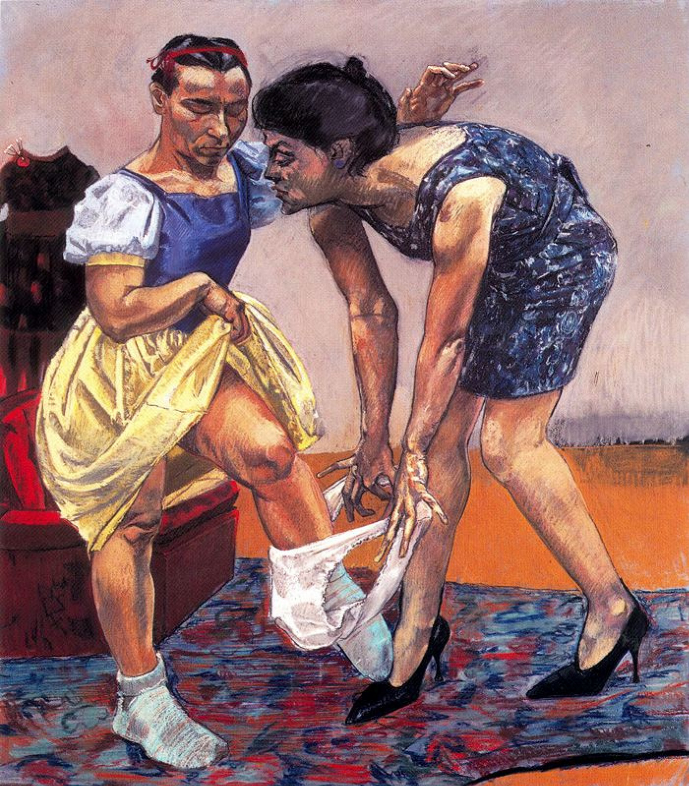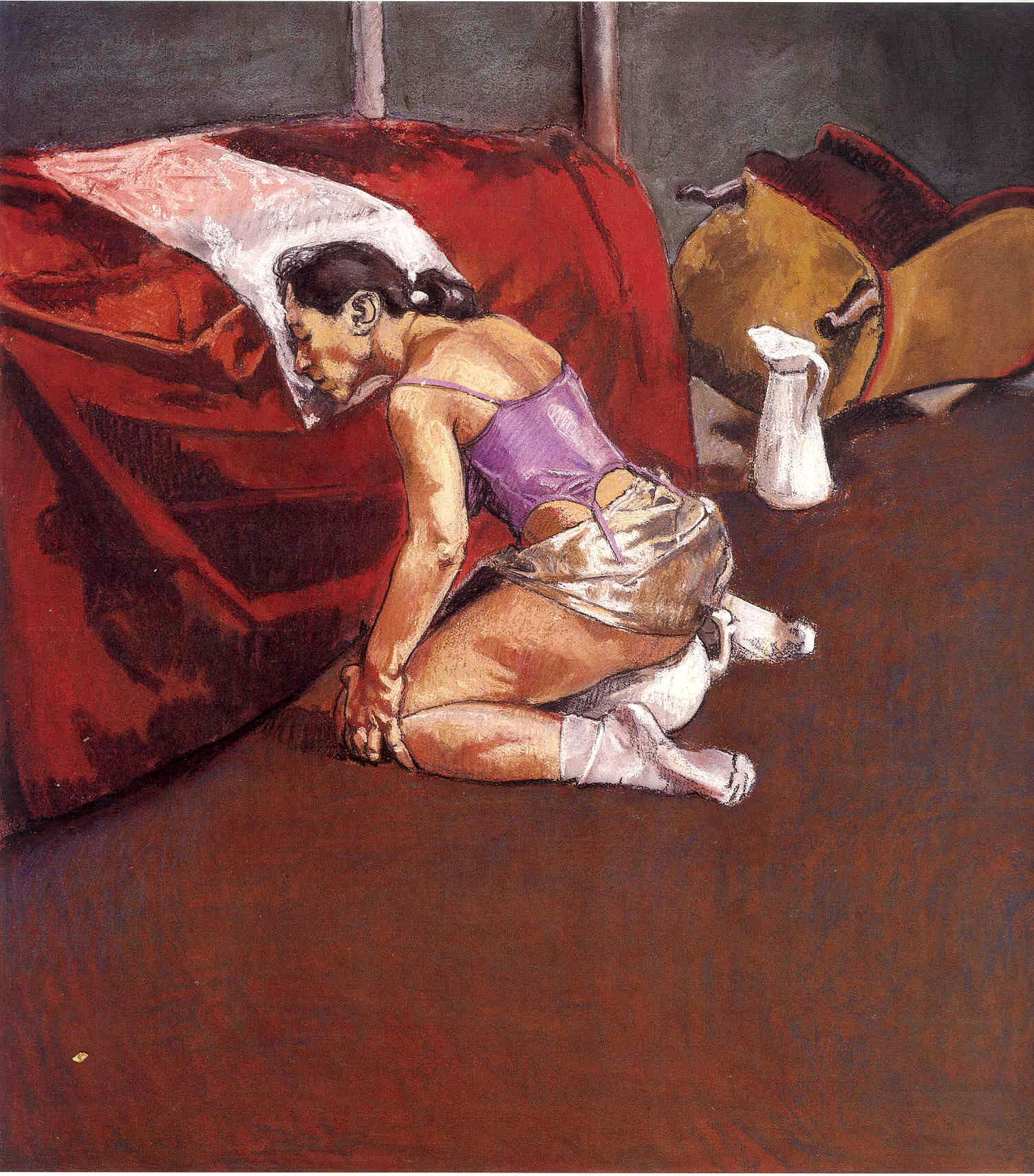 Ik kijk naar de benen van de vrouwen op de schilderijen van Paula Rego. Die zijn kort, stevig, krachtig, gespierd. Nergens ‘verleidelijk, verlokkend’, maar sterk, gewicht dragend. Geen benen om alleen maar naar te kijken; het zijn benen die lopen, dragen, bewegen, ondersteunen. Van hier naar daar voeren. Wat ontroeren ze me, deze benen. Zo weinig zag ik ze nog op deze manier, zo beschouwd, zo afgebeeld. Maar ze waren er altijd al.