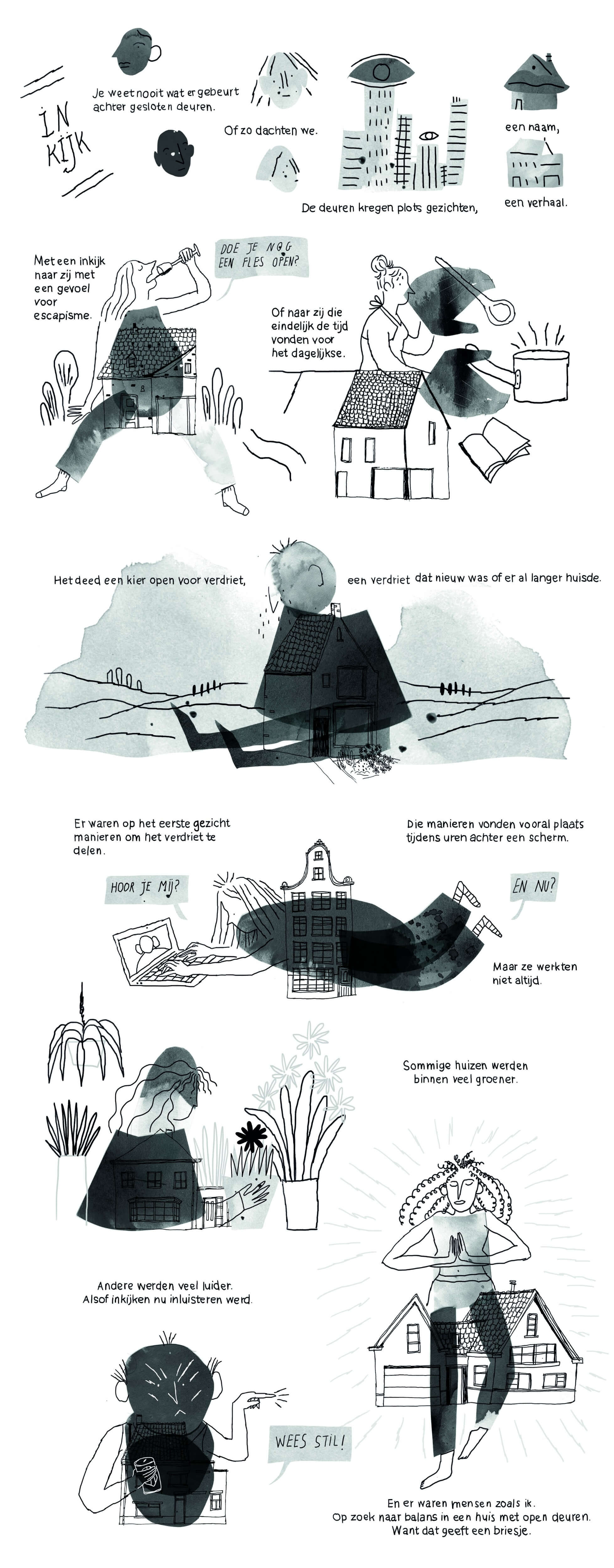 Tijdens de lockdown was er één gemene deler: we moesten allemaal binnenblijven. Striptekenaar Shamisa Debroey maakte een strip over die ervaring, waar iedereen anders mee omging. De een gingen drinken, de ander bestelde nieuwe planten, en bijna allemaal werden we onderworpen aan de perikelen rondom videobellen en het bestrijden van eenzaamheid. Zo kreeg elke gesloten deur een verhaal.
